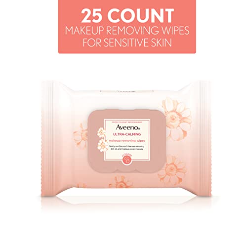 25-count pack of Aveeno Ultra Calming Oil-Free Makeup Removing Face Wipes to help cleanse sensitive skin of dirt, oil, bacteria and makeup – even mascara