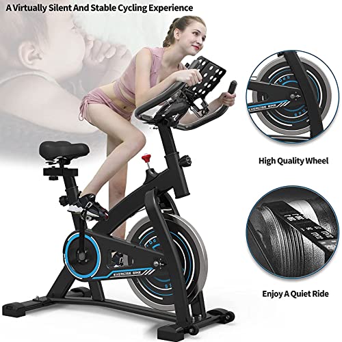 Smooth Stationary Ergonomic High Reinforcement Exercise Bike:The sturdy steel frame,300 Pounds maximum user weight guarantee the stability while cycling.The belt driven system provides a smoother and quieter ride than chain transport. It won’t disturb your neighbors or sleeping kids. The highly dense sponge on the backrest and seat of the exercise bike offers comfortable and ergonomic cushioning to relieve your pressure.
