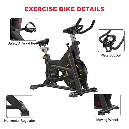 Smooth Stationary Ergonomic High Reinforcement Exercise Bike:The sturdy steel frame,300 Pounds maximum user weight guarantee the stability while cycling.The belt driven system provides a smoother and quieter ride than chain transport. It won’t disturb your neighbors or sleeping kids. The highly dense sponge on the backrest and seat of the exercise bike offers comfortable and ergonomic cushioning to relieve your pressure.