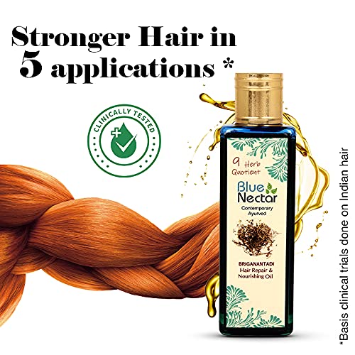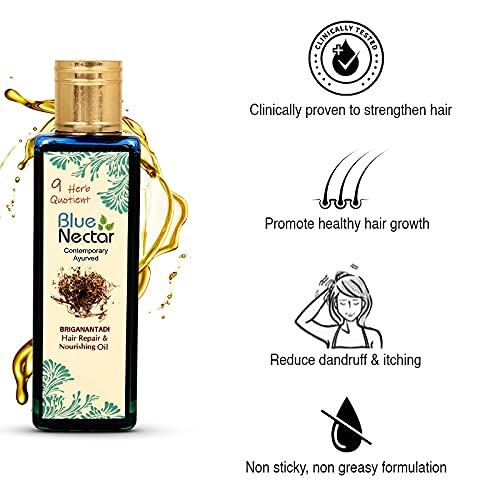 Blue Nectar Briganantadi Hair Repair and Treatment Oil is a Natural Ayurvedic oil that may help fight premature hair loss. With a herb quotient of 9 Herbs, like Bhringraj (King of hair herbs), Amla (Gooseberry), Malkangiri(Staff Tree or Tree of Life), Mulethi (Liquorice), Neel Patra (Indigo) etc are potent herbs used in hair care products with positive results since ancient times. Blue Nectar Hair Oil is a perfect blend of pure cold pressed Seasame and Coconut Oil infused with genuine natural herbs. This natural oil may help accelerate natural hair growth when combined with good lifestyle and healthy diet. Additionally, Blue Nectar Hair Oil provides vital nourishment to hair and scalp. This may help reduce dandruff. Blue Nectar Hair Oil goes to the root of Hair and Scalp to provide hydration and nourishment for growth of lustrous hair.