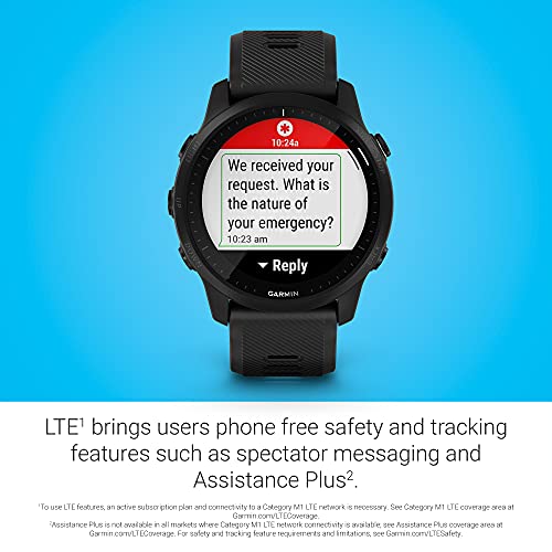 LTE connectivity (must have an active subscription plan and connectivity to a Category M1 LTE network) enables phone-free safety and tracking features, including LiveTrack and Assistance Plus, a feature that connects you to the Garmin IERCC, a professional 24/7 emergency monitoring and response center (Assistance Plus is not available in all markets where Category M1 LTE network connectivity is available), plus you can receive messages from fans during your race