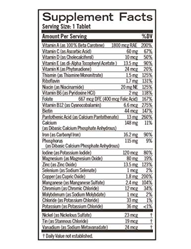 BALANCED NUTRITION SUPPORT: The balanced combination of 26 vitamins and minerals in Geritol Multivitamin gives you close to 100% RDA of many essential vitamins and minerals including Vitamin A, C, D, E, B1 & B2, Niacin, B6, Folic Acid, B12, Pantothenic Acid and Manganese.