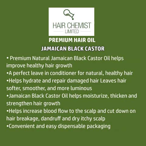 Hair Chemist Jamaican Black Castor Oil helps improve healthy hair growth. Hair Chemist Jamaican Black Castor Oil is a perfect leave in conditioner for natural, healthy hair.Helps hydrate and repair damaged hair, and leaves hair softer, smoother and more luminous. Hair Chemist Jamaican Black Castor Oil helps moisturize, thicken and strengthen hair, encouraging healthy hair growth.Helps increase blood flow to the scalp and reduce hair breakage and dry, itchy scalp.