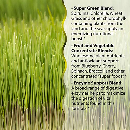 SUPER GREEN ENERGY BOOST – Formula includes spirulina, chlorella, wheat grass, red algae, brown kelp and other chlorophyll-containing plants from the land and the sea supply a powerful nutritional boost.