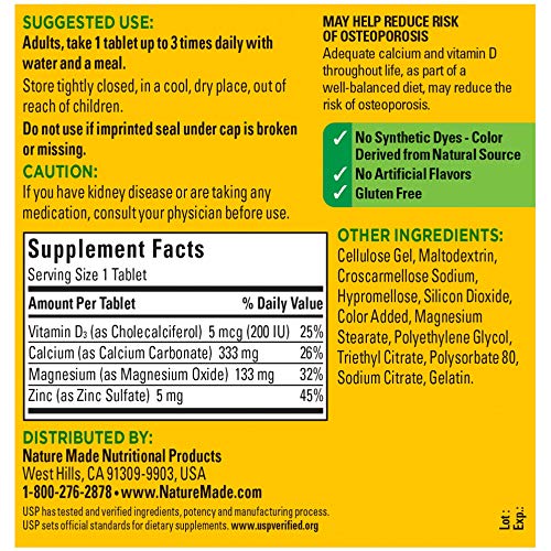 Nature Made Calcium Magnesium and Zinc is a calcium supplement scientifically formulated to provide bone support nutrients as well as those that aid in nerve, muscle and metabolic reactions. Adequate calcium, along with a well-balanced diet, plays an integral role in supporting bone health and may help reduce risk of osteoporosis later in life. Adequate calcium is also important for teens and young adults and post-menopausal women. Magnesium helps support nerve, muscle, and metabolic functions. Each tablet of Nature Made Calcium, Magnesium & Zinc provides 333 mg of calcium, 133 mg of magnesium, and 5 mg of zinc as well as 5 mcg (200 IU) of vitamin D.