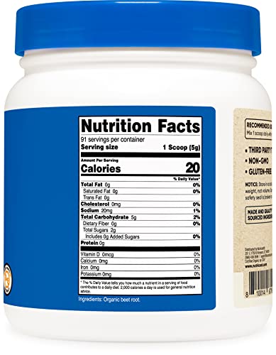 Nutricost’s beet root powder is USDA certified organic and contains 1 pound of high quality beet root powder. It is vegetarian friendly, non-gmo, gluten free, soy free, and made in a GMP compliant, FDA registered facility. Please be aware that beet root can easily stain.