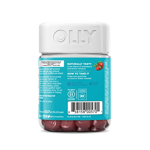 OLLY GOODBYE STRESS GUMMY: Calm your mind and counter bad vibes with the help of our strawberry and lemon verbena flavored gummy supplements. This stress support zen blend uses GABA and L-Theanine to help you stay calm, cool, and collected.*