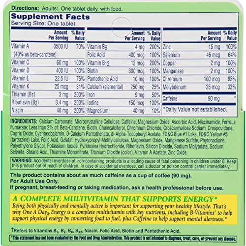 One A Day Energy Multivitamin designed with B-Vitamins which help convert food to energy, and caffeine to help support mental alertness