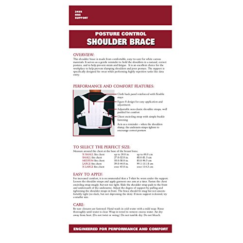 OTC brand (model 2455) Posture Control Shoulder Brace. Serves as a gentle reminder to hold the shoulders in a natural, correct posture, and to help prevent strain and fatigue. It is an excellent choice for the workplace to help prevent slumping shoulders and poor posture. The comfortable support is specifically designed for wear while performing highly repetitive tasks like data entry. To determine your size please measure around chest at the base of chest bone. X-Small (up to 26 Inches), Small (27-32 Inches), Medium (33-38 inches), Large (39-44 Inches), X-Large (Over 45 Inches).