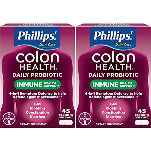 Phillips’ Daily Care Colon Health Daily Probiotic, 45 Capsules each (Value Pack of 2). Phillips’ Colon Health Probiotic provides 4-in-1 Symptom Defense against occasional: Gas, Bloating, Constipation, Diarrhea.