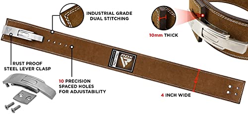 COWHIDE LEATHER belt is 4 inch wide and 10mm thick. This weightlifting belt assists in crouches, powerlifting, dead lifts, or jerks. Resilient build averts cracks, splits and tears.