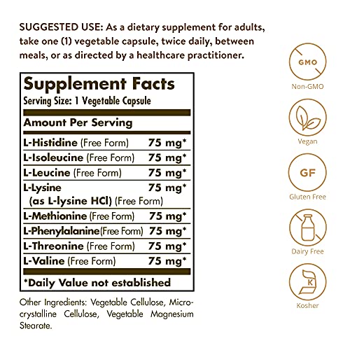 Gluten, Wheat & Dairy Free; Solgar Essential Amino Complex is non-GMO, vegan, kosher, and free of: gluten, wheat, dairy, soy, yeast, sugar, sodium, artificial flavor, sweetener, preservatives and color; Suitable for vegetarians