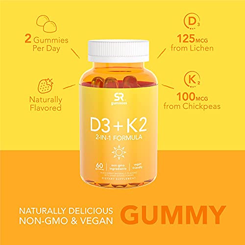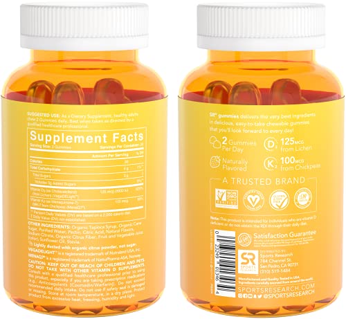 Sports Research Vegan Vitamin D3 + K2 Gummy Supplements – 5000iu Vitamin D with 100mcg Mk7 Vitamin K – Supports Calcium…