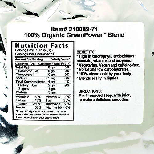 1 lb of Organic GreenPower Blend, packaged in a resealable mylar bag. Starwest’s Organic GreenPower Blend is a synergistic blend of 14 potent, concentrated plant foods (green vegetables), naturally packed with nutrients that encourage optimum health. It is a complete green supplement packed with all the vitamins, minerals and enzymes that our bodies desperately need, provided by the “superfood” spirulina, which is 60% vegetable protein; barley grass, which is naturally rich in copper, potassium, calcium, iron, manganese, zinc, enzymes and chlorophyll. High in Vitamin A, Iron, and B Vitamins. Vegetarian and Vegan. Fat-free and caffeine free. No sweeteners, fillers (such as such as bran, rice or oat), or non-functional ingredients added. Loaded with spirulina and chlorophyll. Easily digested and absorbed by your body. Blends easily in juice, fruit smoothies, soy milk, rice milk, almond milk or water.