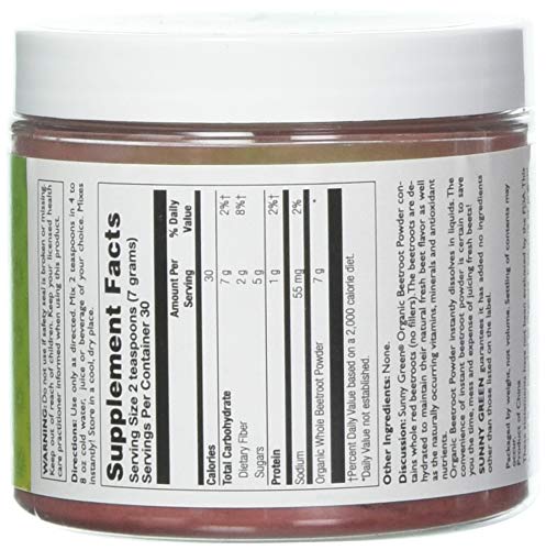 Sunny Green Organic Beetroot Powder contains whole red beetroots. The beetroots are dehydrated to maintain their natural fresh beet flavor as well as the naturally occurring vitamins, minerals and antioxidants nutrients. Organic Beetroot Powder instantly dissolves in liquids. The convenience of instant beetroot powder is certain to save you the time, mess and expense of juicing fresh beets.