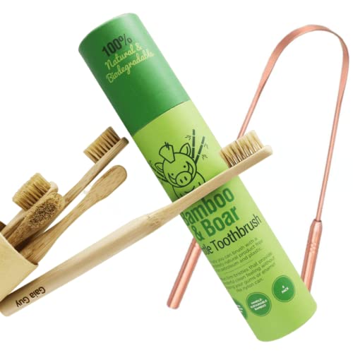 Plastic-Free Oral Health Care Bundle – 6 Bamboo and Boar Bristle Toothbrushes and a Copper Tongue Scraper